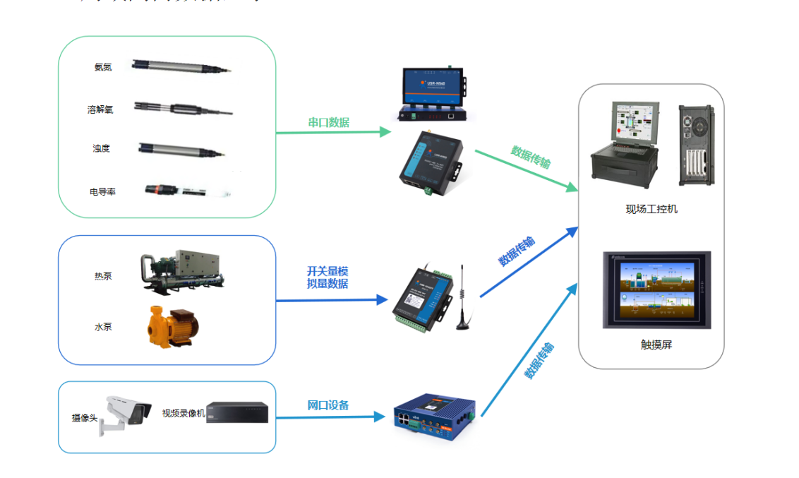 v 若現(xiàn)場終端設(shè)備為串口設(shè)備,可以通過串口服務(wù)器或wifi串口服務(wù)器將數(shù)據(jù)傳輸至現(xiàn)場本地工控機或觸摸屏顯示。此時要確認現(xiàn)場是否方便布線,若方便布線可選用串口服務(wù)器,若現(xiàn)場有wifi覆蓋可選用wifi串口服務(wù)器;