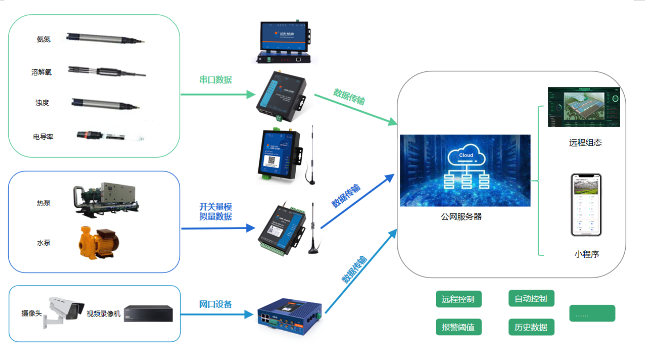 v 若現(xiàn)場終端設(shè)備為開關(guān)量或模擬量設(shè)備,可以通過網(wǎng)絡(luò)IO設(shè)備將數(shù)據(jù)傳輸至公網(wǎng)服務(wù)器。若現(xiàn)場有4G信號可選用網(wǎng)絡(luò)IO中CAT1或G5版本;若現(xiàn)場方便布線或有wifi覆蓋可選用EWR版本;