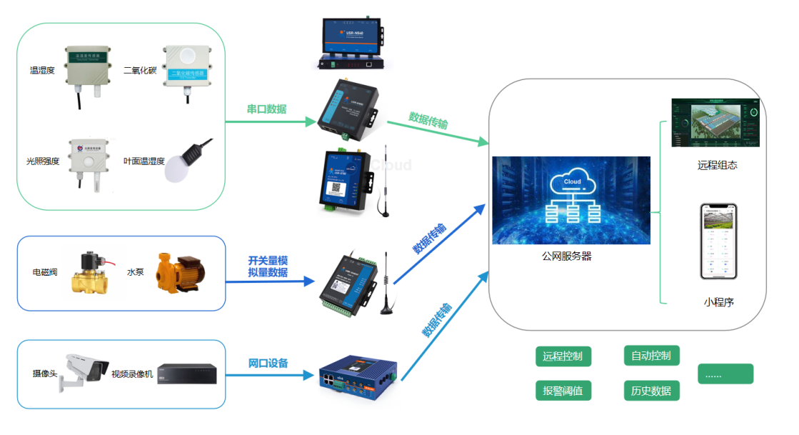 v 若現(xiàn)場(chǎng)終端設(shè)備為開(kāi)關(guān)量或模擬量設(shè)備,可以通過(guò)網(wǎng)絡(luò)IO設(shè)備將數(shù)據(jù)傳輸至公網(wǎng)服務(wù)器。若現(xiàn)場(chǎng)有4G信號(hào)可選用網(wǎng)絡(luò)IO中CAT1或G5版本;若現(xiàn)場(chǎng)方便布線(xiàn)或有wifi覆蓋可選用EWR版本;