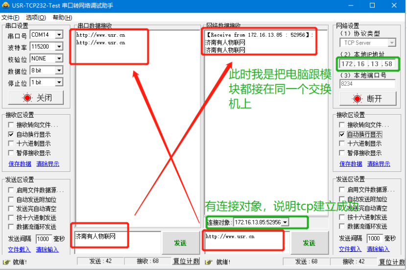 將軟件串口設(shè)置中的串口號(hào)配置為COM14。由于設(shè)備默認(rèn)協(xié)議類型為TCP client,所以電腦端需要設(shè)置為TCP server, IP和端口號(hào)為模塊的目標(biāo)IP:192.168.0.201和目標(biāo)端口號(hào):8234。 顯示連接對(duì)象,證明連接成功。此時(shí)從串口助手(com14)發(fā)送數(shù)據(jù),網(wǎng)絡(luò)助手可以收到;從網(wǎng)絡(luò)助手發(fā)數(shù)據(jù),串口助手也能收到。