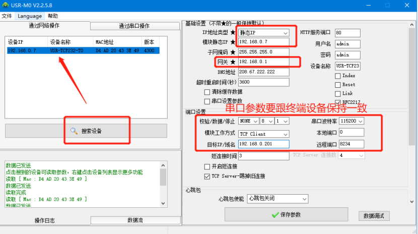 3.點(diǎn)擊“搜索設(shè)備”當(dāng)搜索列表中出現(xiàn)T0的設(shè)備后,單擊搜索到的設(shè)備,查看其配置信息(上圖為默認(rèn)配置信息)。