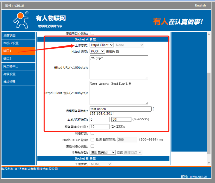 4、端口1工作方式設置HTTPD模式,POST,遠程服務器地址填test.usr.cn,遠程端口填80,本地端口號設置為0。URL填/2.php?,不濾除包頭。保存參數(shù),重啟模塊。