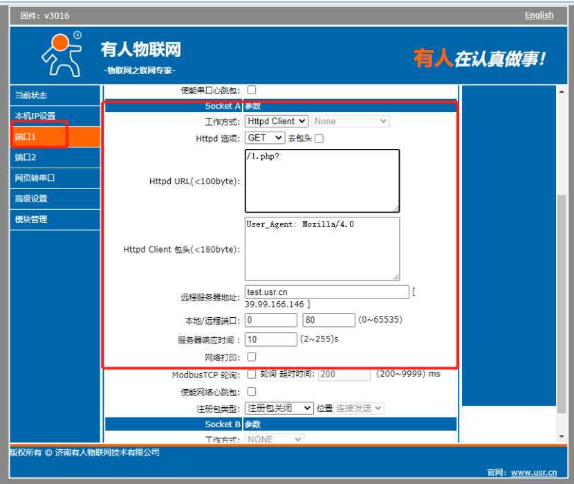 4、端口1工作方式設(shè)置HTTPD模式,GET,遠(yuǎn)程服務(wù)器地址填test.usr.cn,遠(yuǎn)程端口填80,本地端口號(hào)設(shè)置為0。URL填/2.php?,不濾除包頭。保存參數(shù),重啟模塊。