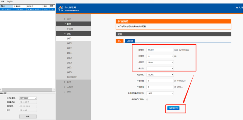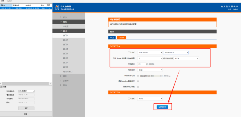 點(diǎn)擊端口1---串口,需要把波特率、數(shù)據(jù)位、校驗(yàn)位、停止位跟串口終端設(shè)備保持一致; SOCKET參數(shù)里,選擇“Tcp server”,選擇“modbus tcp”(這個(gè)是協(xié)議轉(zhuǎn)換功能開(kāi)啟),本地端口23。