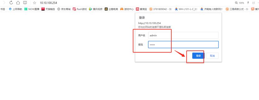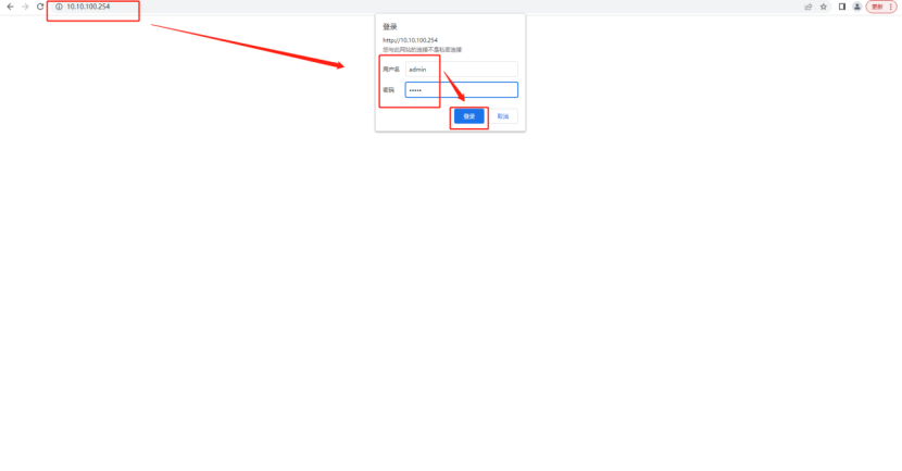1)電腦連接1號w610的WiFi,瀏覽器打開輸出出廠默認(rèn)IP:10.10.100.254,用戶名和密碼都是:admin,進(jìn)入內(nèi)置網(wǎng)頁