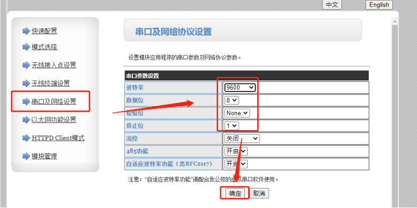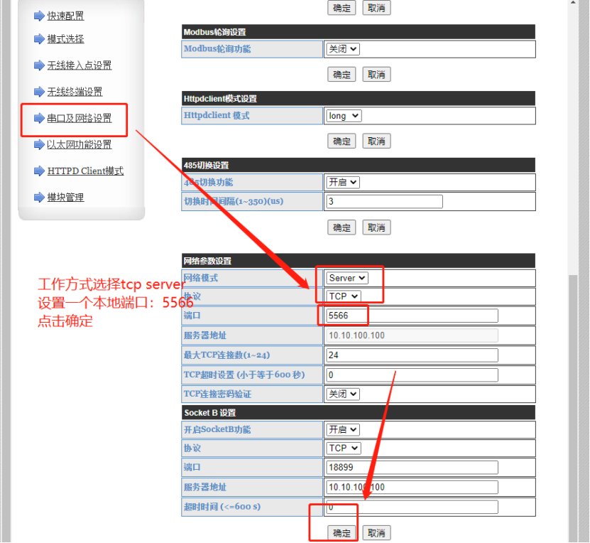 3)在串口及網(wǎng)絡(luò)設(shè)置,波特率等參數(shù)修改成和要接的串口設(shè)備一致。(這里測試修改成9600),點(diǎn)擊確定。工作模式設(shè)置TCP server,設(shè)置本地端口:5566,點(diǎn)擊確定。
