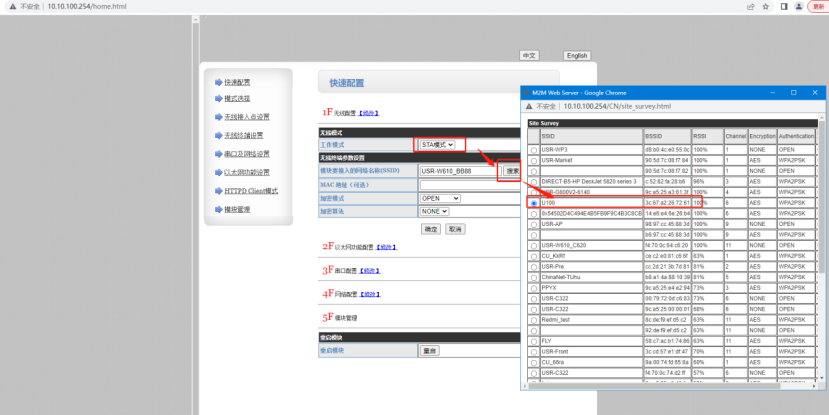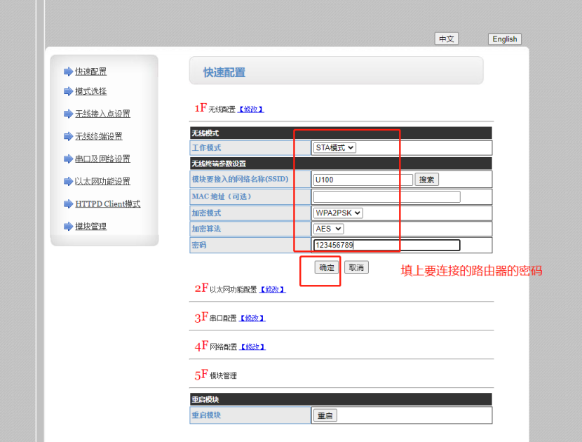 2)1號USR-W610設(shè)置STA模式,連接路由器的WiFi,填上密碼,點(diǎn)擊確定
