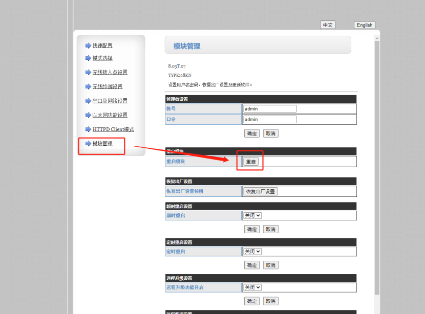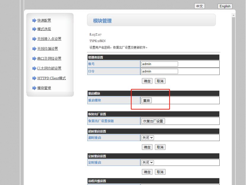 4)在模塊管理里點(diǎn)擊重啟,參數(shù)生效。