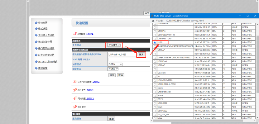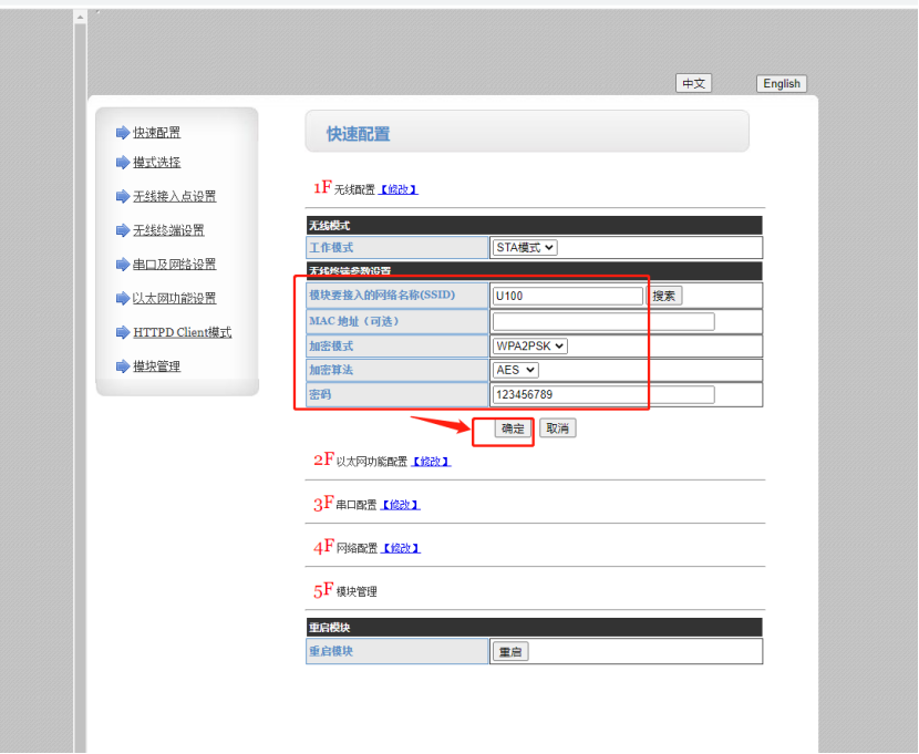 2)USR-W610設(shè)置STA模式,連接路由器的WiFi,填上密碼,點(diǎn)擊確定