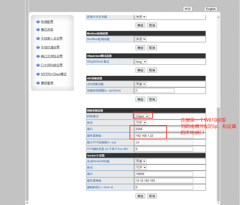 4)工作方式選擇tcp client,去連接1號w610獲取到的ip:192.168.1.22和設(shè)置的本地端口:5566,點(diǎn)擊確定。