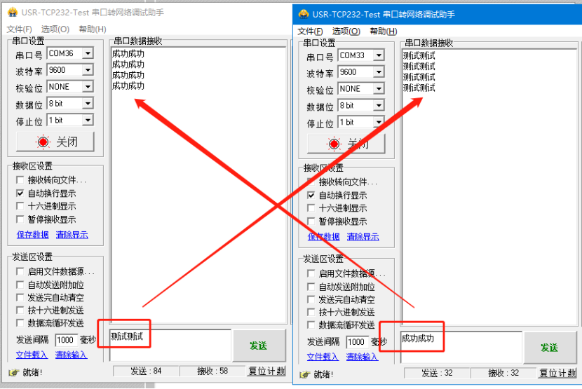 測試通信,用2個(gè)串口調(diào)試助手分別打開2個(gè)610的com口,互發(fā)數(shù)據(jù)。