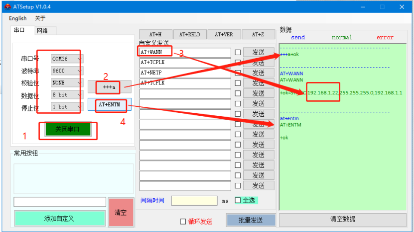 5)用ATSetup軟件按照修改后的波特率打開第一個(gè)w610的com口,點(diǎn)擊+++a進(jìn)入配置狀態(tài),返回a+ok,說明進(jìn)入配置狀態(tài)成功,發(fā)送AT+WANN查詢獲取到路由器分配的ip:192.168.1.22,查詢完畢,點(diǎn)擊AT+ENTM進(jìn)入通信狀態(tài)。