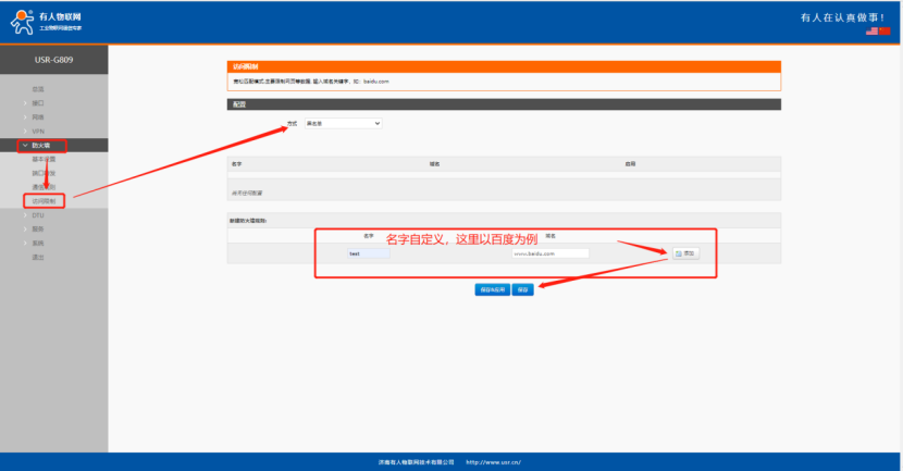 <2>連接路由器的設(shè)備將無(wú)法訪問(wèn)設(shè)置的域名。注:若選擇黑名單,而未添加規(guī)則,默認(rèn)黑名單為空,即所有域名都可以訪問(wèn)。