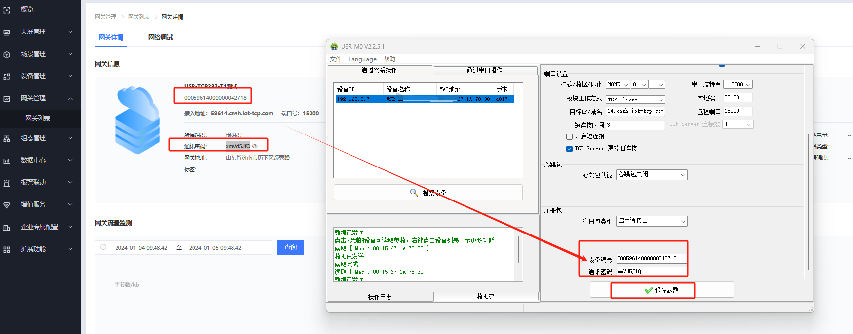 2)工作方式選擇TCP Client,目標(biāo)ip: 59614.cnsh.iot-tcp.com,遠(yuǎn)程端口號:15000,注冊包選用啟用透傳云,設(shè)備編號和通訊密碼可以在有人云平臺設(shè)備列表中的查看中可以查看到。設(shè)置完成后點(diǎn)擊保存參數(shù)。