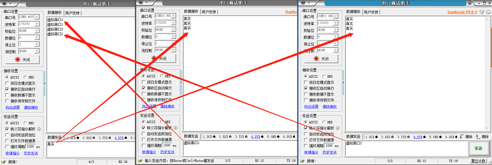 真實(shí)串口和虛擬串口1和虛擬串口2,進(jìn)行數(shù)據(jù)傳輸