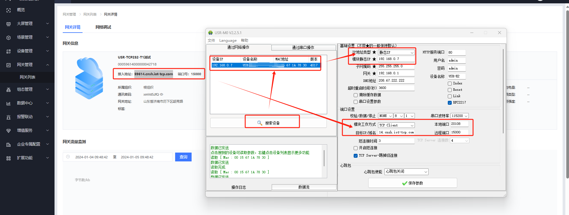 2)工作方式選擇TCP Client,目標(biāo)ip: 59614.cnsh.iot-tcp.com,遠(yuǎn)程端口號:15000,注冊包選用啟用透傳云,設(shè)備編號和通訊密碼可以在有人云平臺設(shè)備列表中的查看中可以查看到。設(shè)置完成后點(diǎn)擊保存參數(shù)。