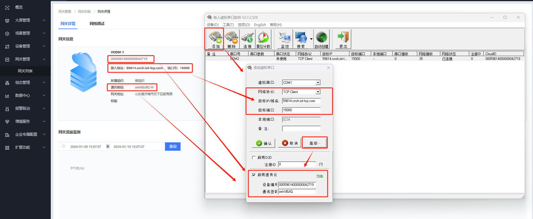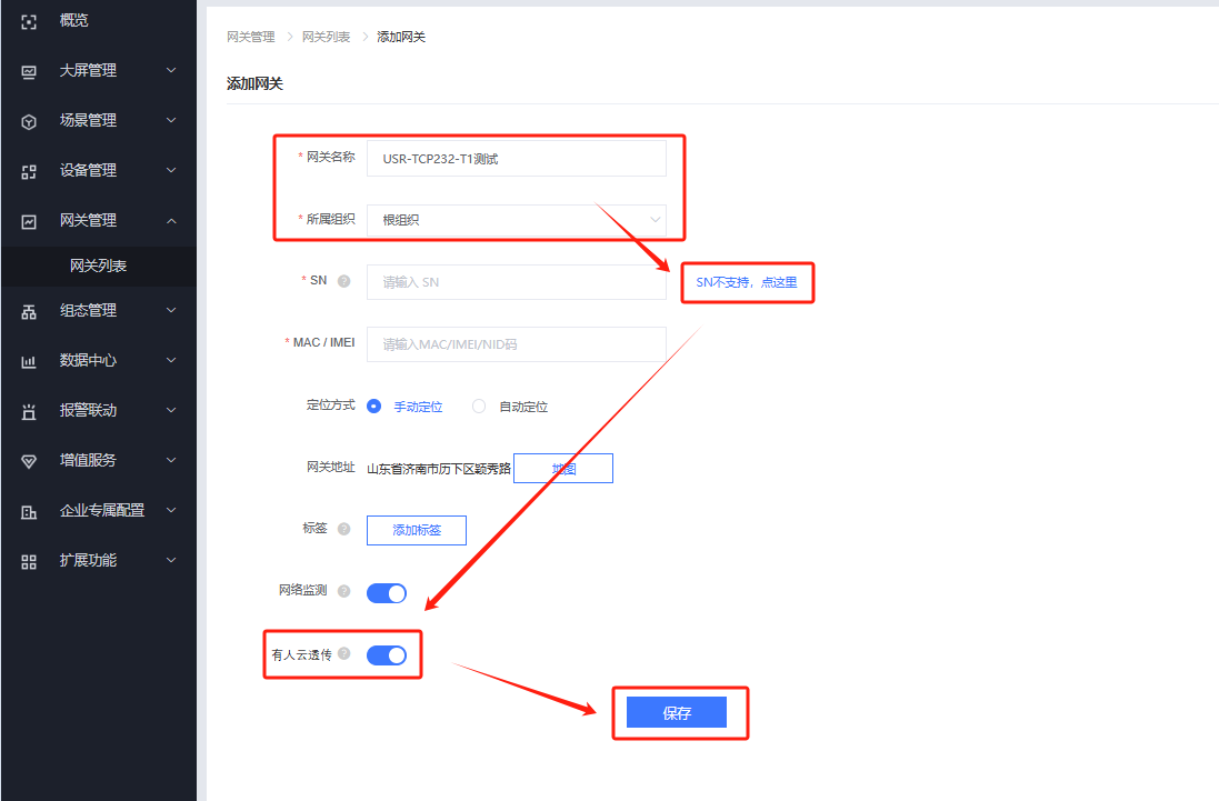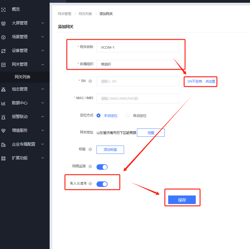 有人云--網(wǎng)關(guān)管理--網(wǎng)關(guān)列表--添加:VCOM-1,根組織,“SN不支持,點(diǎn)這里”,開啟有人云透傳,點(diǎn)擊保存即可