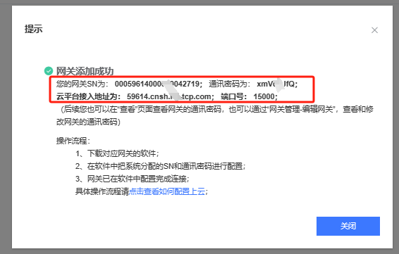 設(shè)備名稱可自定義,所屬組織選擇根組織,T1目前不支持SN碼添加,點(diǎn)擊右側(cè)“沒有SN,點(diǎn)這里”,設(shè)備ID和通訊密碼可以自動(dòng)生成,設(shè)備ID20位,通訊密碼必須是8位(支持修改密碼),開啟有人云透傳。設(shè)置完成后點(diǎn)擊保存即可看到平臺給分配的接入地址和SN 密碼等信息。