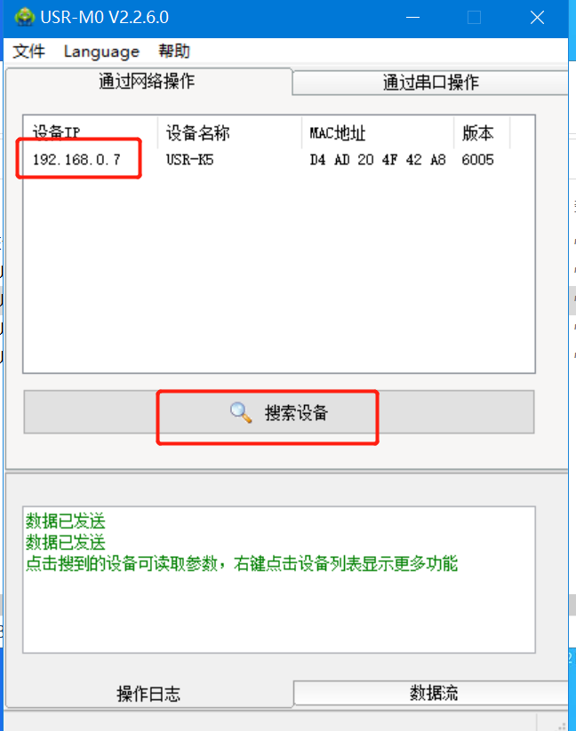 1、K5模塊和電腦通過網(wǎng)線直連,打開M0設(shè)置軟件,點(diǎn)擊“搜索”,可以搜到K5,此時(shí)是192.168.0.7的靜態(tài)IP。