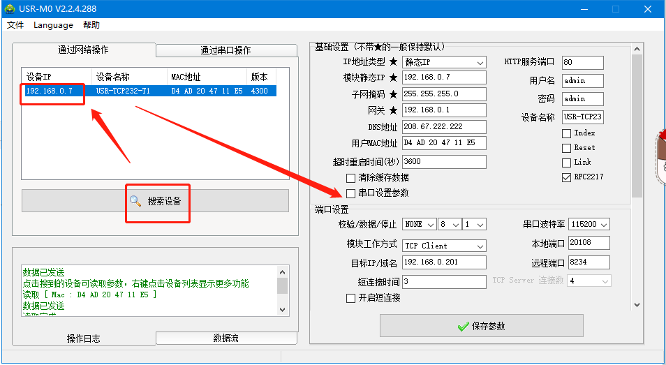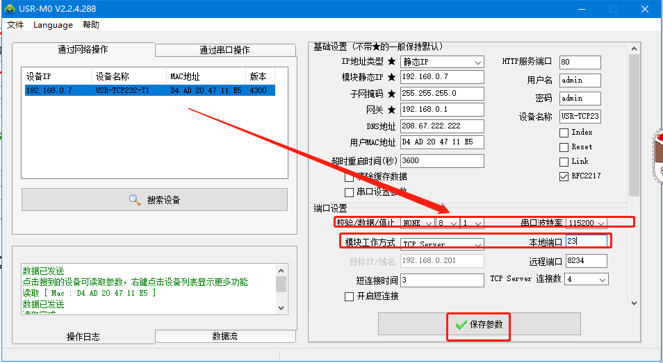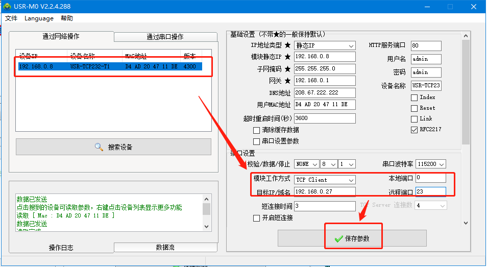 用M0設(shè)置軟件搜索設(shè)備,獲取T1 的IP參數(shù),點擊T1的IP,將T1的IP設(shè)置192.168.0.8,工作方式TCP client,本地端口 0,遠(yuǎn)程端口23,目標(biāo)IP 192.168.0.7,點擊保存參數(shù)