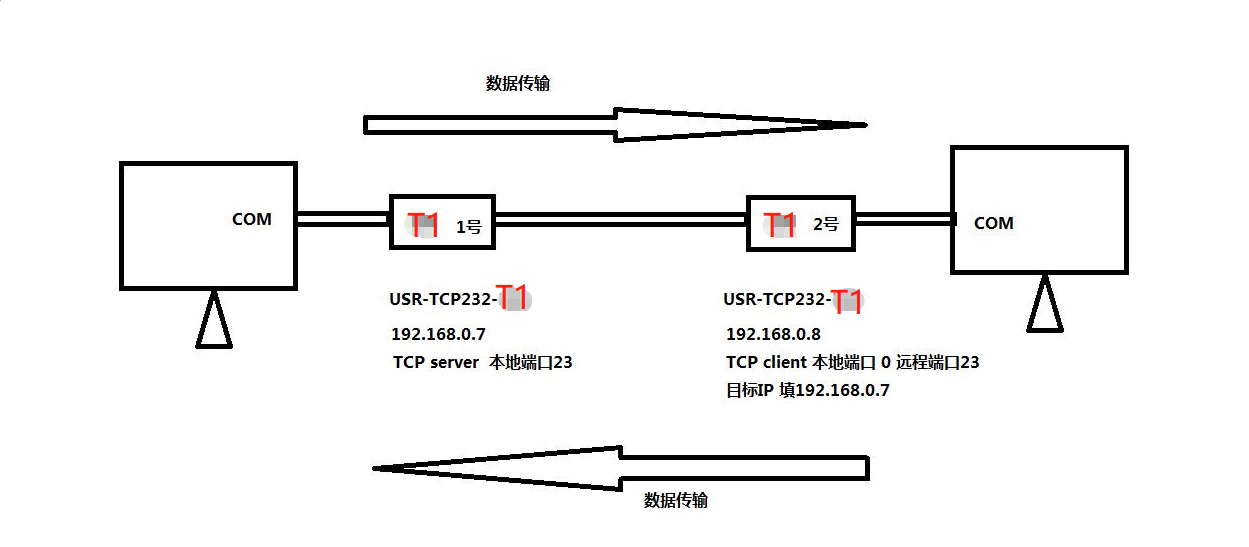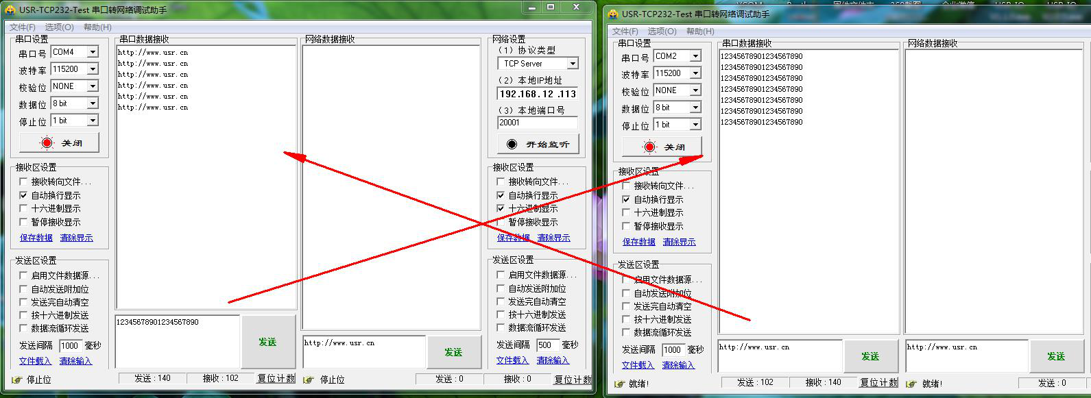電腦用串口助手打開2個T1的COM口,用對應(yīng)T1的串口參數(shù),然后進(jìn)行數(shù)據(jù)傳輸。