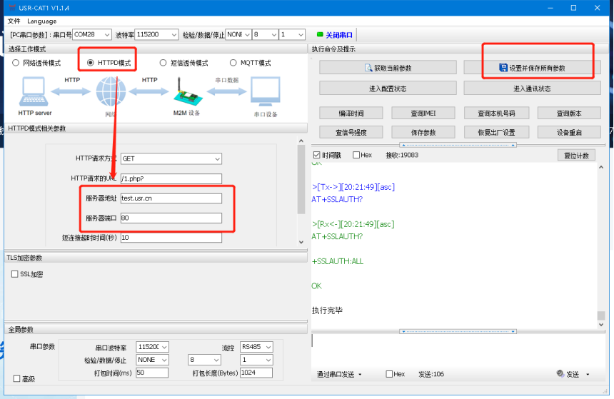 2、點(diǎn)擊HTTPD模式,配置服務(wù)器的信息。設(shè)置HTTP請求方式為GET,HTTP服務(wù)器地址:test.usr.cn, HTTP服務(wù)器端口號為80,HTTP報頭路徑為/1.php?,設(shè)置完成后點(diǎn)擊設(shè)置并保存所有參數(shù)。最后點(diǎn)擊進(jìn)入通訊狀態(tài)。