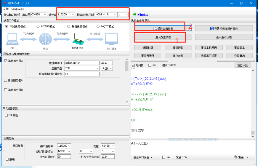 1、下載并安裝設(shè)備的設(shè)置軟件,在電腦的設(shè)備管理器中查看電腦端生成的com口(com28),在設(shè)置軟件中打開對應(yīng)的com口,使用設(shè)備的默認(rèn)串口參數(shù)(115200 N 8 1)進(jìn)入產(chǎn)品的配置界面并且獲取當(dāng)前參數(shù)。