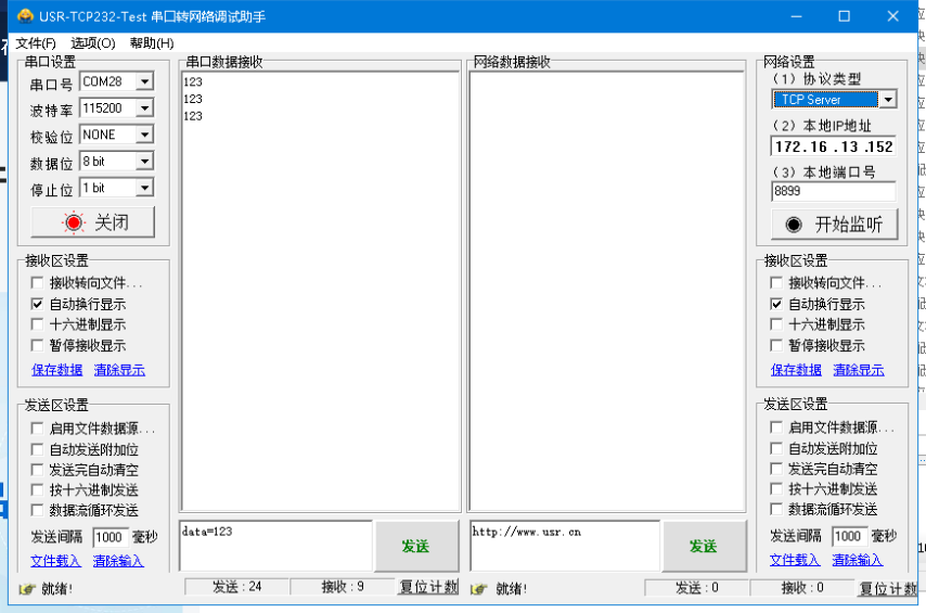 安裝測試軟件(建議關(guān)閉電腦的防火墻以及殺毒軟件)使用設(shè)備在電腦端生成的com口,用設(shè)備默認(rèn)的串口參數(shù)打開串口,在串口段發(fā)送數(shù)據(jù):data=123可以看到服務(wù)器返回值為123。由此成功建立httpd client測試。