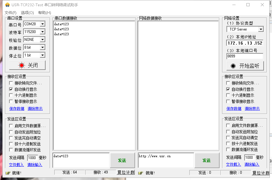 安裝測(cè)試軟件(建議關(guān)閉電腦的防火墻以及殺毒軟件)使用設(shè)備在電腦端生成的com口,用設(shè)備默認(rèn)的串口參數(shù)打開串口,在串口段發(fā)送數(shù)據(jù):data=123可以看到服務(wù)器返回值data=123。由此成功建立httpd client測(cè)試。