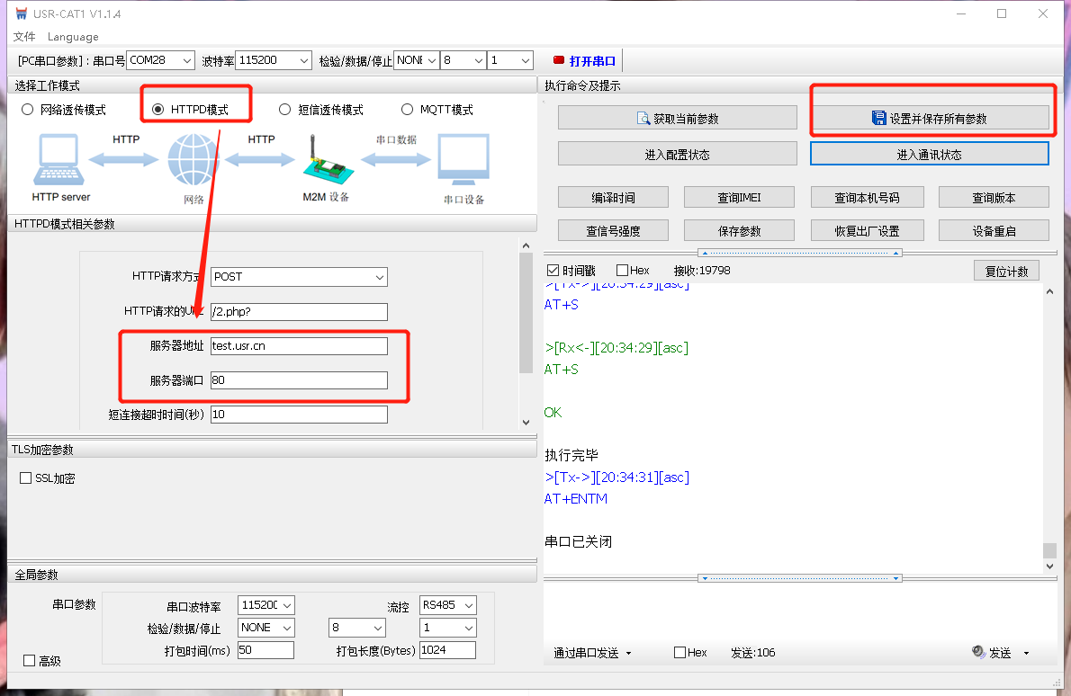 2、點(diǎn)擊HTTPD模式,配置服務(wù)器的信息。設(shè)置HTTP請(qǐng)求方式為post,HTTP服務(wù)器地址:test.usr.cn, HTTP服務(wù)器端口號(hào)為80,HTTP報(bào)頭路徑為/2.php?設(shè)置完成后點(diǎn)擊設(shè)置并保存所有參數(shù)。最后點(diǎn)擊進(jìn)入通訊狀態(tài)。