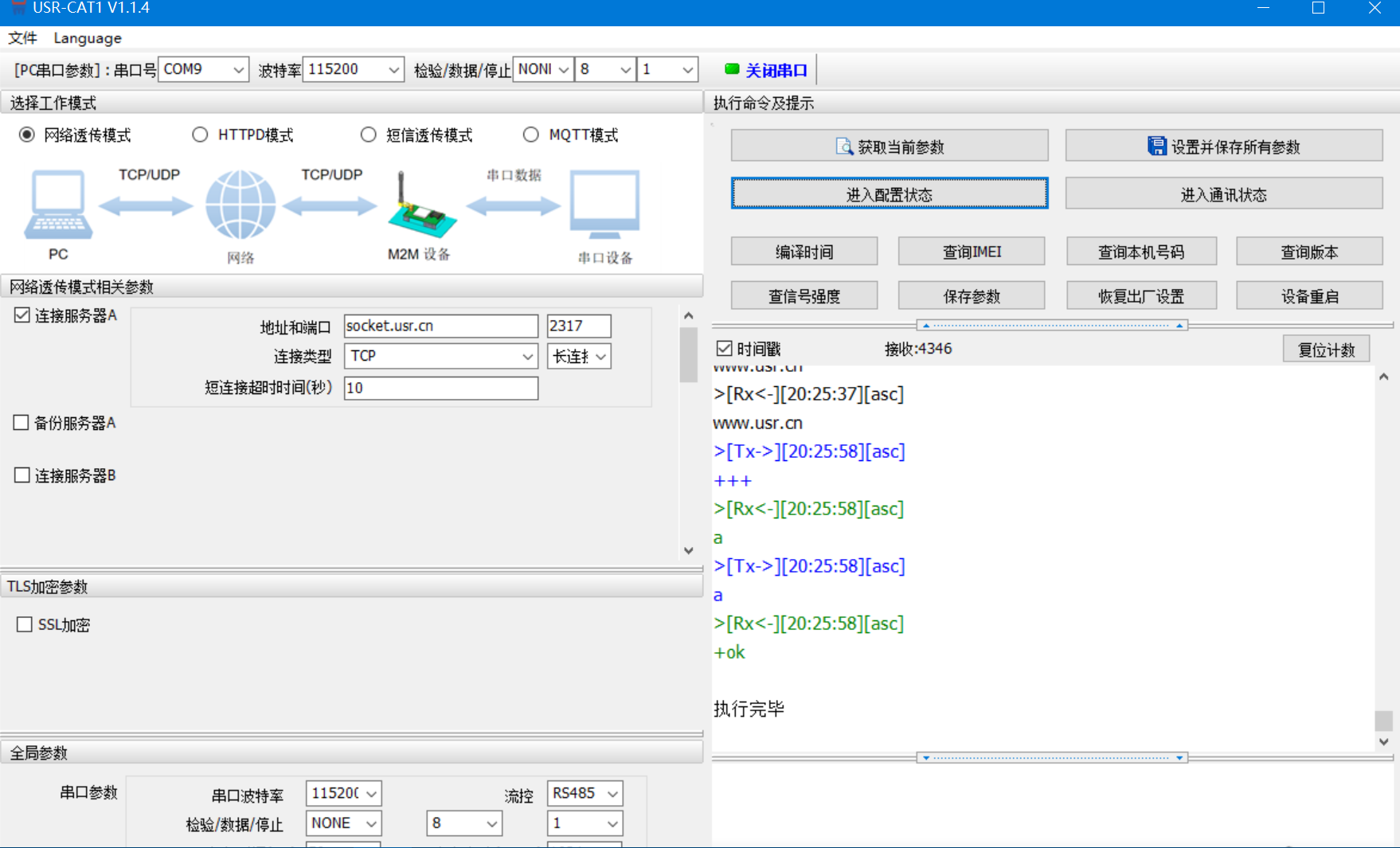 注:點(diǎn)擊進(jìn)入配置狀態(tài),如果模塊能返回+ok的字符,說明電腦和模塊連接是沒有問題的