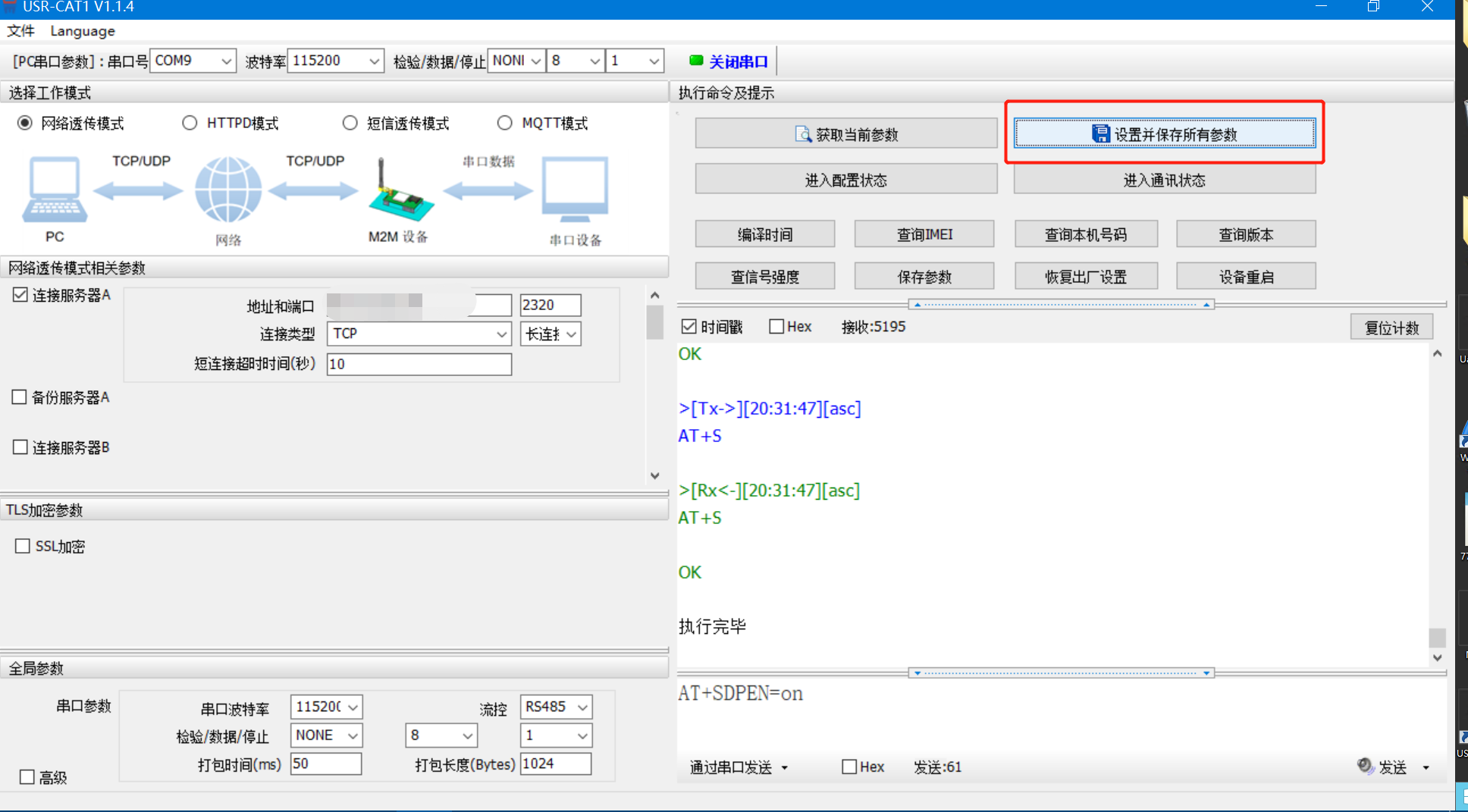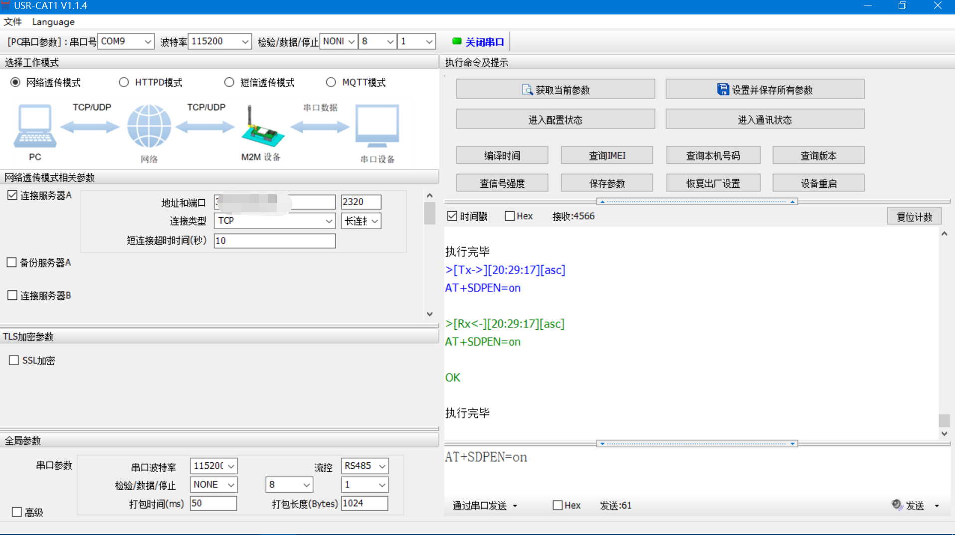 3、使能socket套接字分發(fā)功能:發(fā)送AT+SDPEN=ON(AT指令后需要加回車換行),設(shè)置連接的服務(wù)器地址和端口號(hào),然后重啟設(shè)備使設(shè)置生效。注:我用的是我司測試服務(wù)器,大家以實(shí)際使用服務(wù)器為準(zhǔn)填寫。