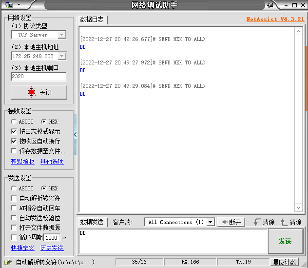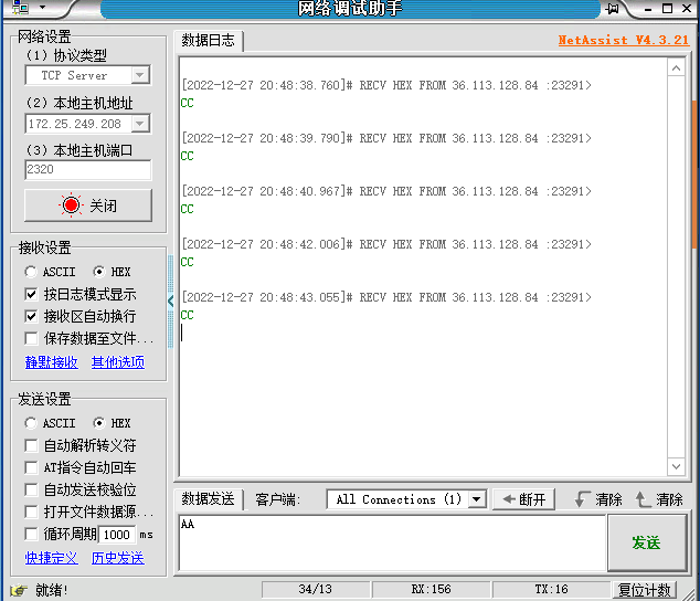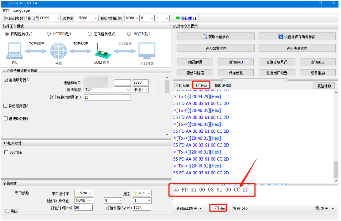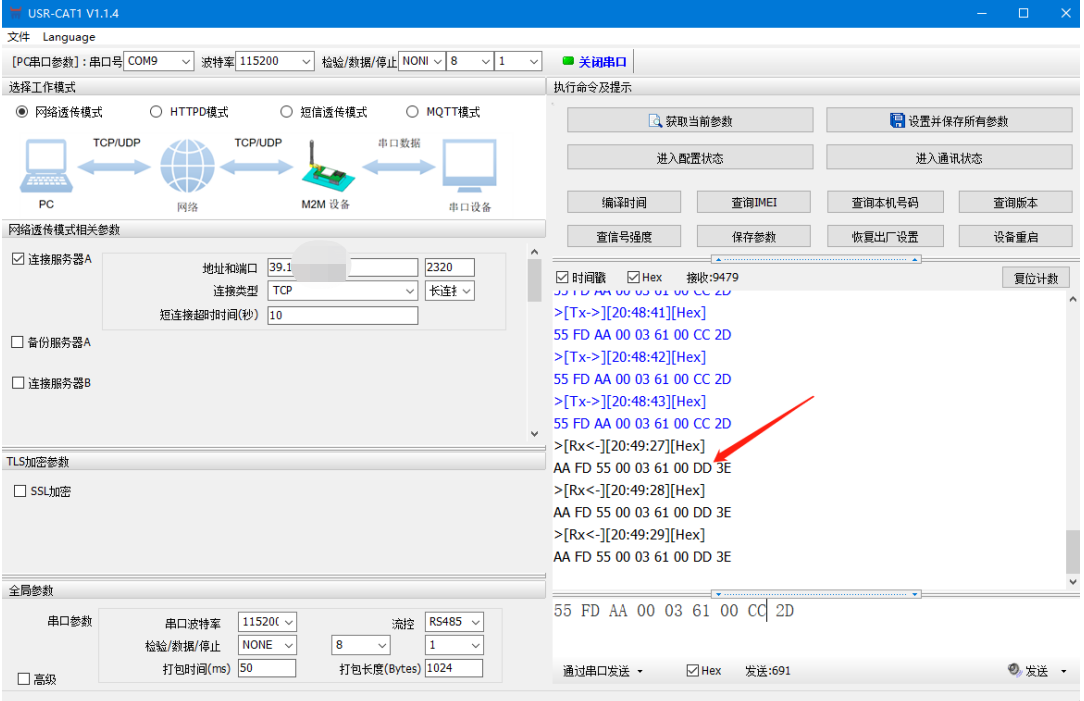 4、重啟后,模塊會(huì)主動(dòng)連接服務(wù)器,通過串口發(fā)送指定格式的數(shù)據(jù)出去。