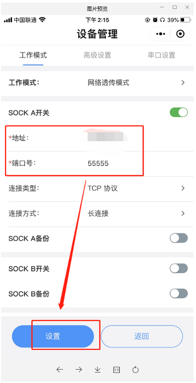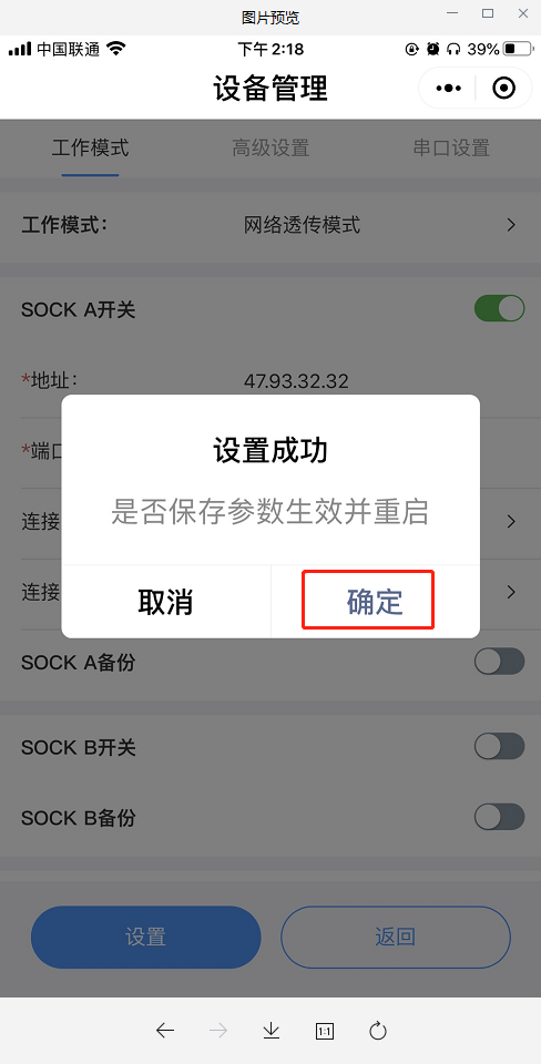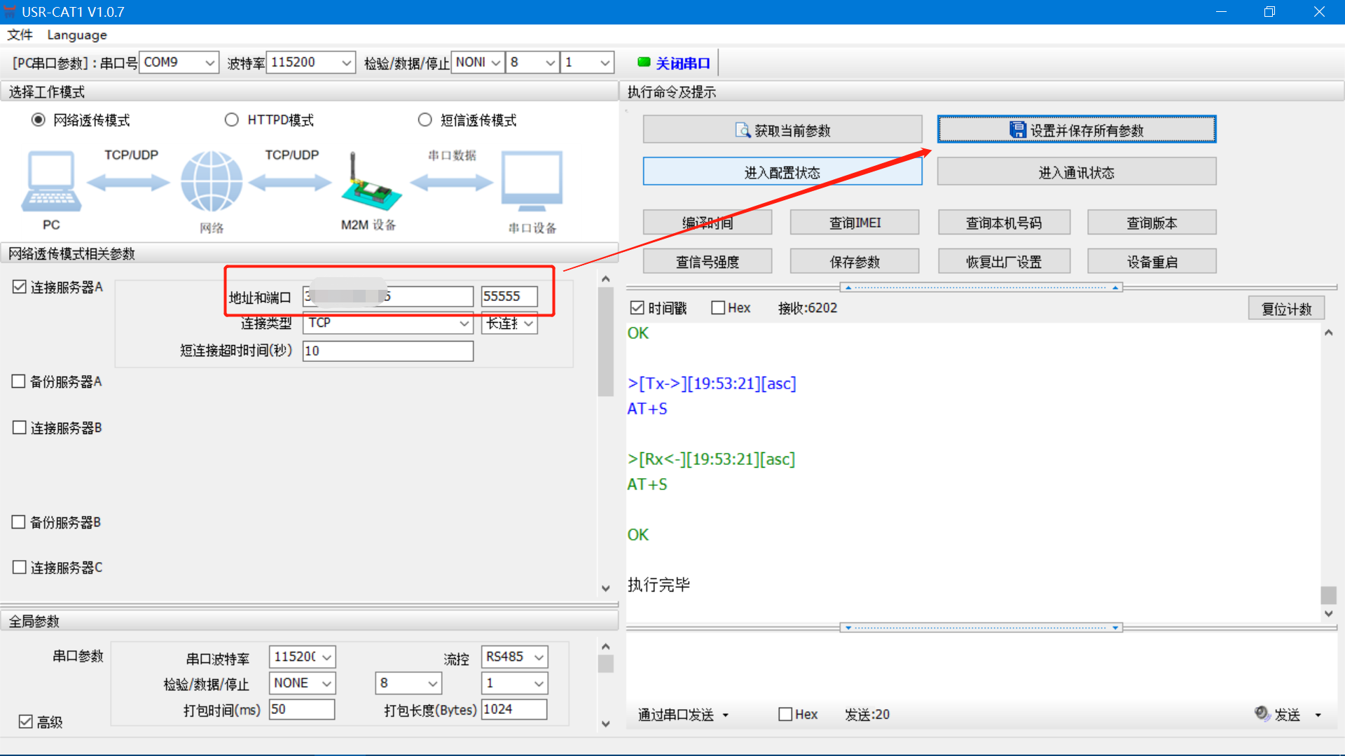 (2)設(shè)置服務(wù)器A的地址和端口,修改參數(shù)后,設(shè)置并保存所有參數(shù),等待模塊重啟成功