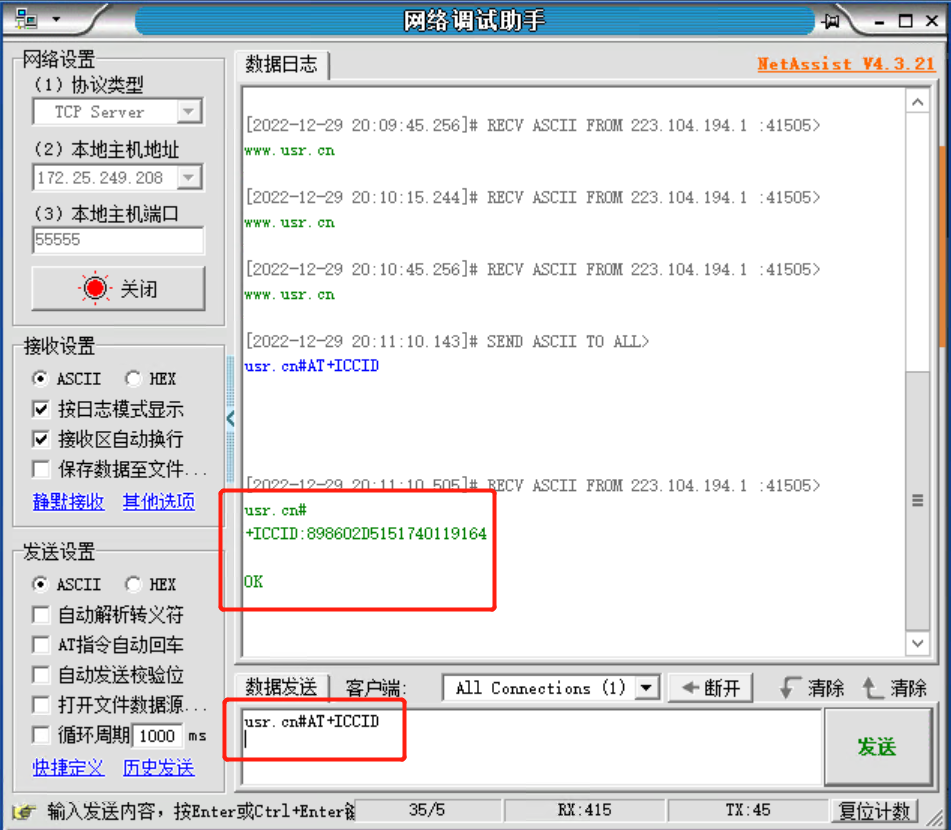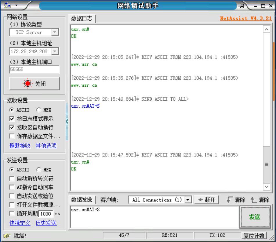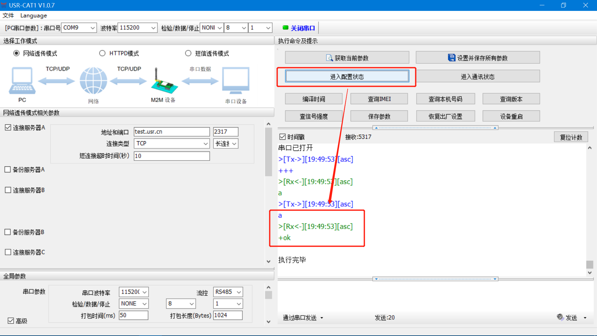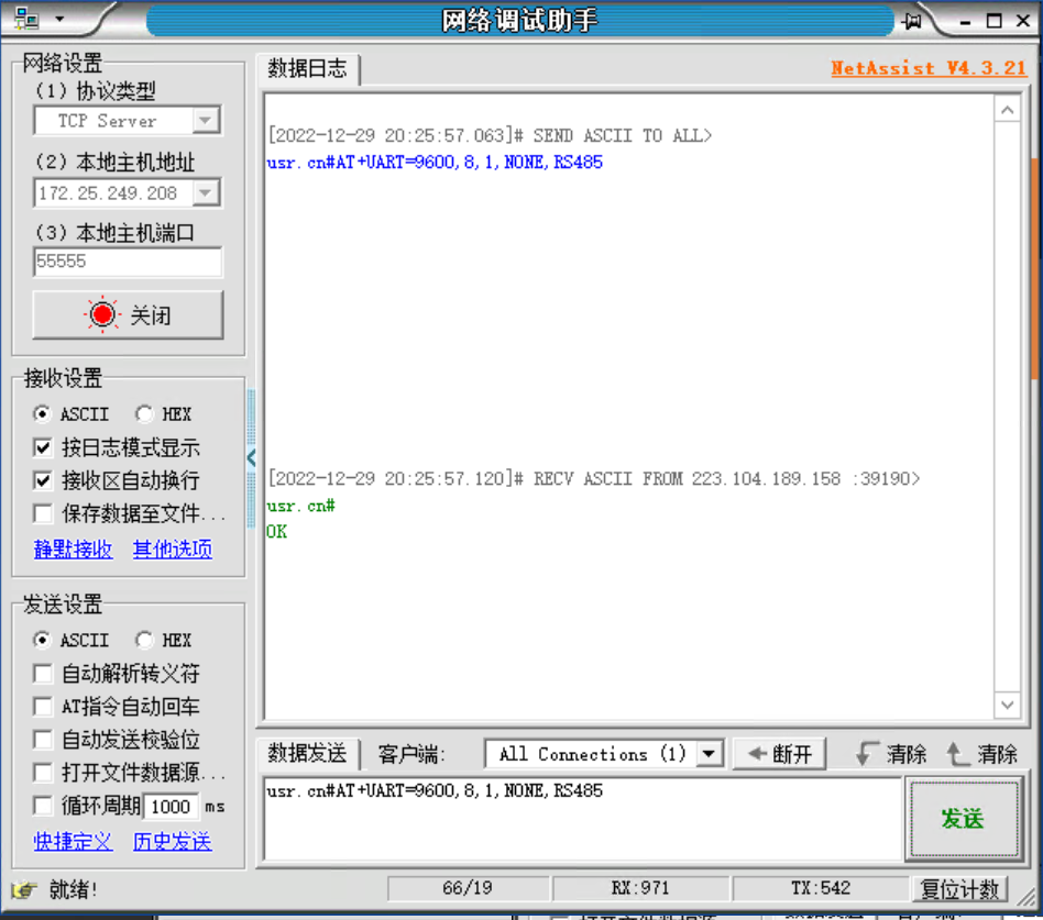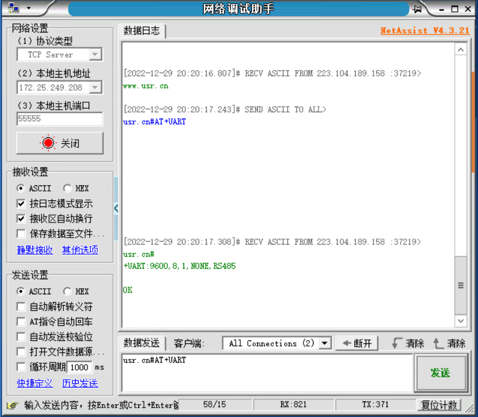 7. 更改以后發(fā)送usr.cn#AT+S+回車換行 重啟以后參數(shù)保存成功;然后重新建立連接以后查詢串口參數(shù),可以看到串口波特率已經(jīng)變?yōu)?600