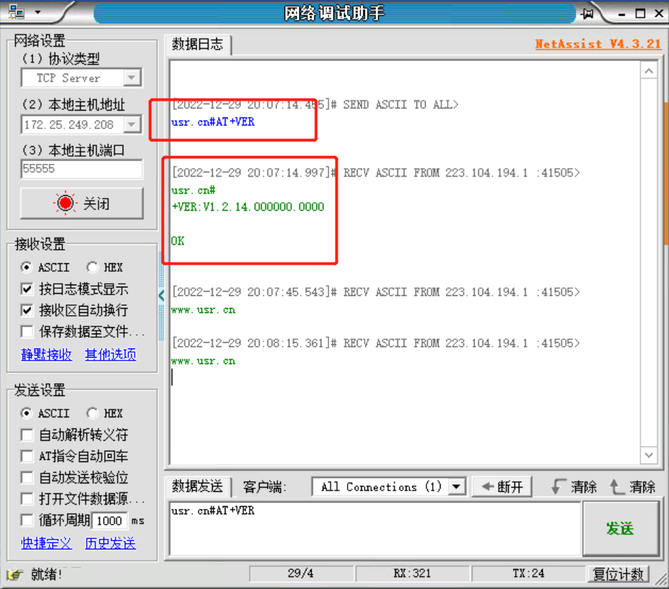 4.查詢版本:在串口發(fā)送usr.cn#AT+VER+回車換行 可以看到模塊返回固件版本號(hào)