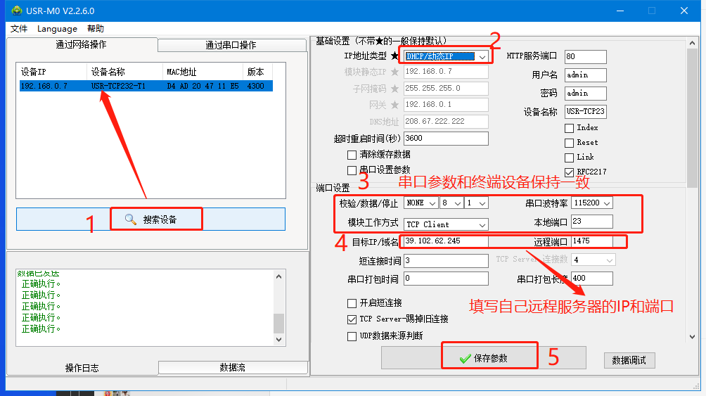需要把S1模塊的ip改成DHCP獲取,或者改成與交換機同網段的靜態(tài)ip。把串口參數、ip端口填好后,點擊保存參數,才能生效。