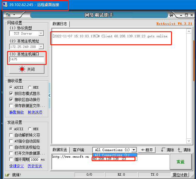4. 接下來把S1模塊的網口接到可以上外網的交換機或者路由器上,將電腦接入相同的交換機路由器,在服務器上打開一個監(jiān)聽端口的網絡助手進行測試,如下圖會顯示連接成功。