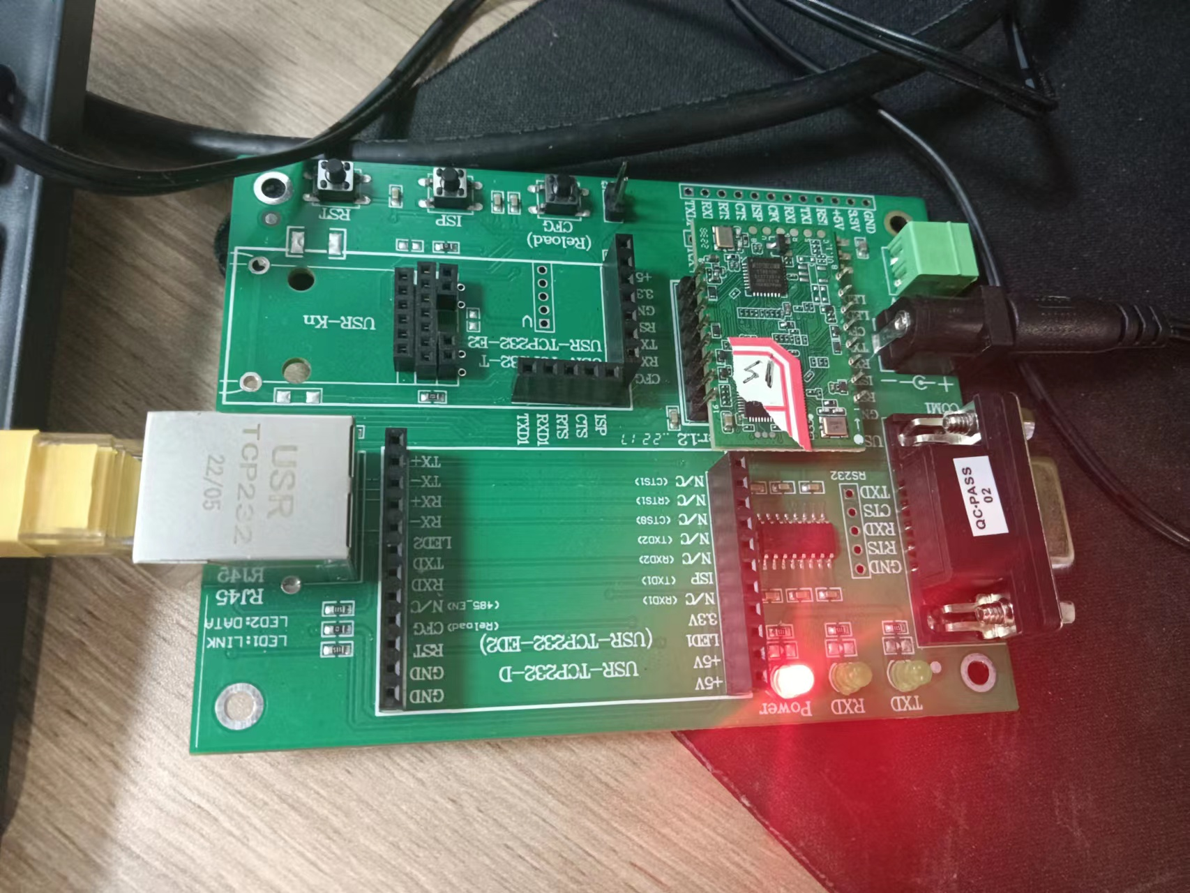 以下測(cè)試USR-TCP232-S1模塊均在評(píng)估板上進(jìn)行,評(píng)估板串口是RS232接口,評(píng)估板電源供電是5V。