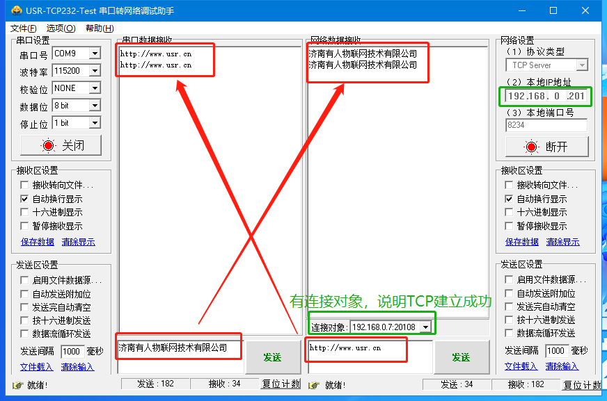 將軟件串口設(shè)置中的串口號(hào)配置為COM9。由于設(shè)備默認(rèn)協(xié)議類型為TCP client,所以電腦端需要設(shè)置為TCP server, IP和端口號(hào)為模塊的目標(biāo)IP:192.168.0.201和目標(biāo)端口號(hào):8234。 顯示連接對(duì)象,證明連接成功。此時(shí)從串口助手(com9)發(fā)送數(shù)據(jù),網(wǎng)絡(luò)助手可以收到;從網(wǎng)絡(luò)助手發(fā)數(shù)據(jù),串口助手也能收到。