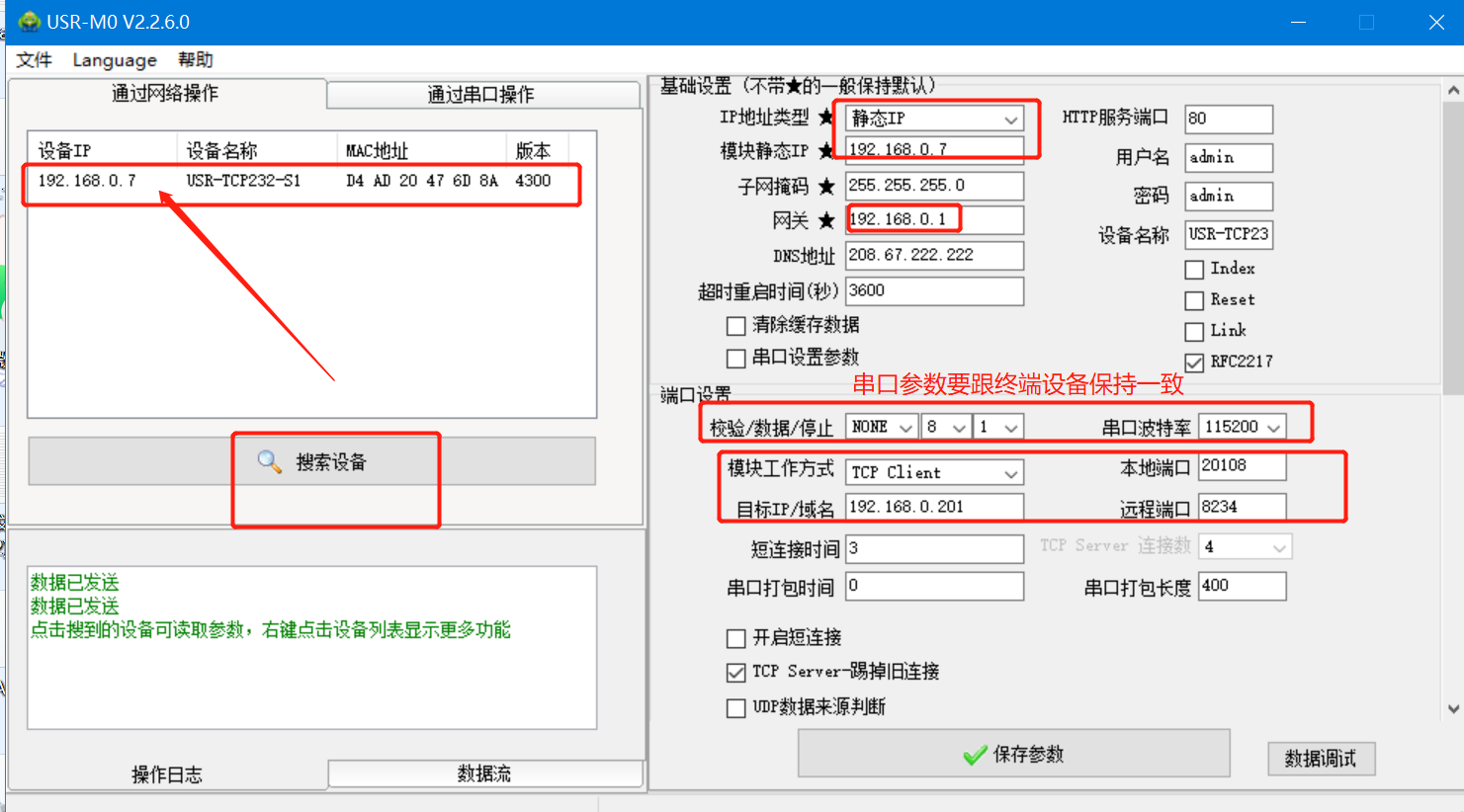 3.點(diǎn)擊“搜索設(shè)備”當(dāng)搜索列表中出現(xiàn)S1的設(shè)備后,單擊搜索到的設(shè)備,查看其配置信息(上圖為默認(rèn)配置信息)。