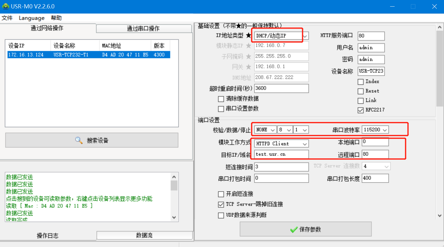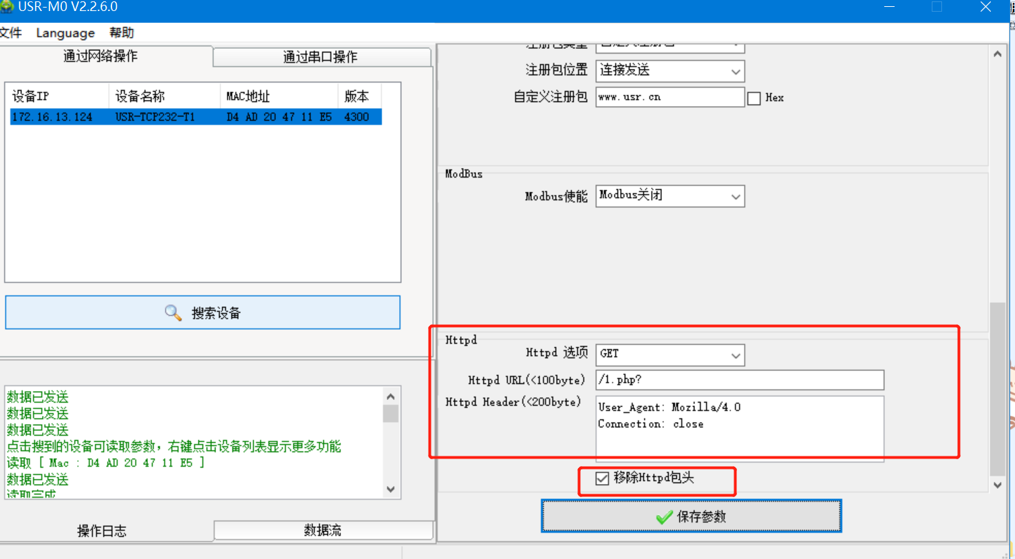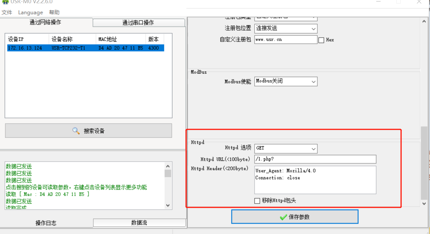 4.IP設(shè)置為DHCP,模塊設(shè)置為Httpd Client模式,請求方式GET,URL為/1.php?,設(shè)置服務(wù)器地址test.usr.cn,端口80,設(shè)置并保存所有參數(shù),重啟模塊。(本說明文檔使用為有人測試服務(wù)器)