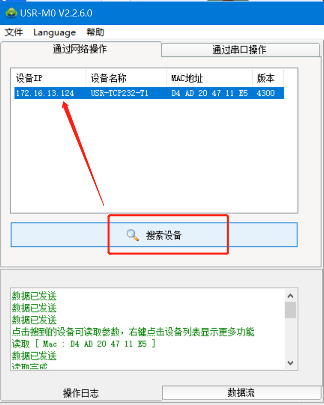 3. 點(diǎn)擊“搜索設(shè)備”當(dāng)搜索列表中出現(xiàn)T1的設(shè)備后,單擊搜索到的設(shè)備,查看其配置信息(上圖為默認(rèn)配置信息)。