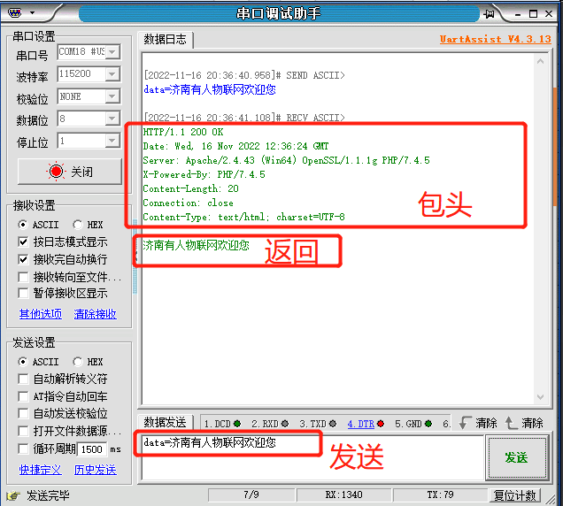 5.按照data=的格式從串口發(fā)送data=濟(jì)南有人物聯(lián)網(wǎng)歡迎您,會看到服務(wù)器返回的報(bào)頭和數(shù)據(jù)。