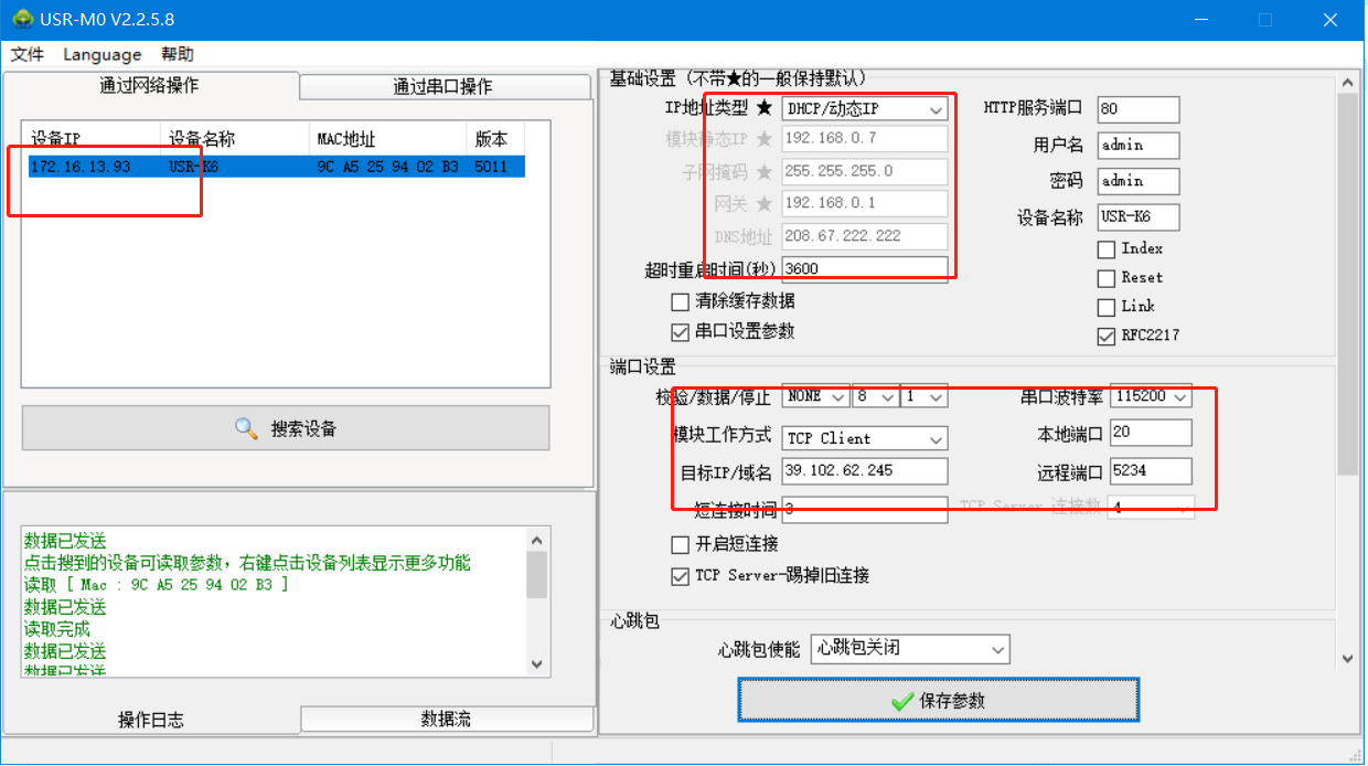 4. IP地址類型更改為DHCP/動態(tài)IP,工作方式選擇TCP Client,目標IP:39.102.62.245(我司測試線上服務(wù)器),遠程端口號:5234,設(shè)置完成后點擊保存參數(shù)。