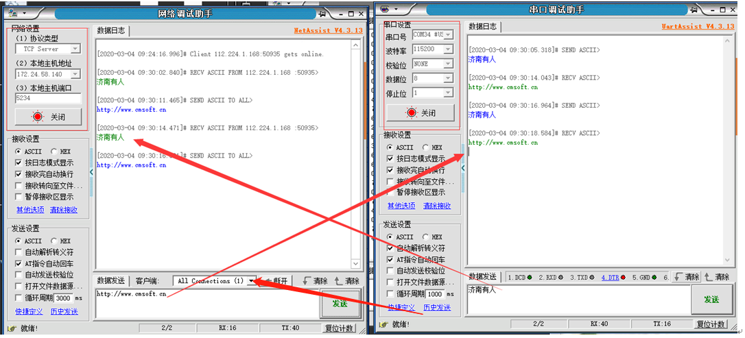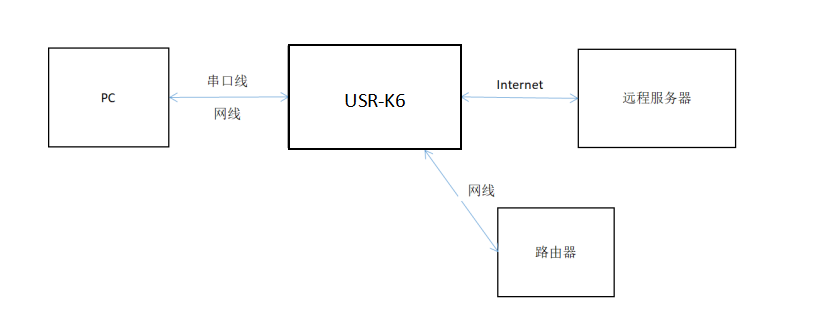 2. 數(shù)據(jù)流向:串口調(diào)試助手軟件---USR-K6-----遠程服務(wù)器