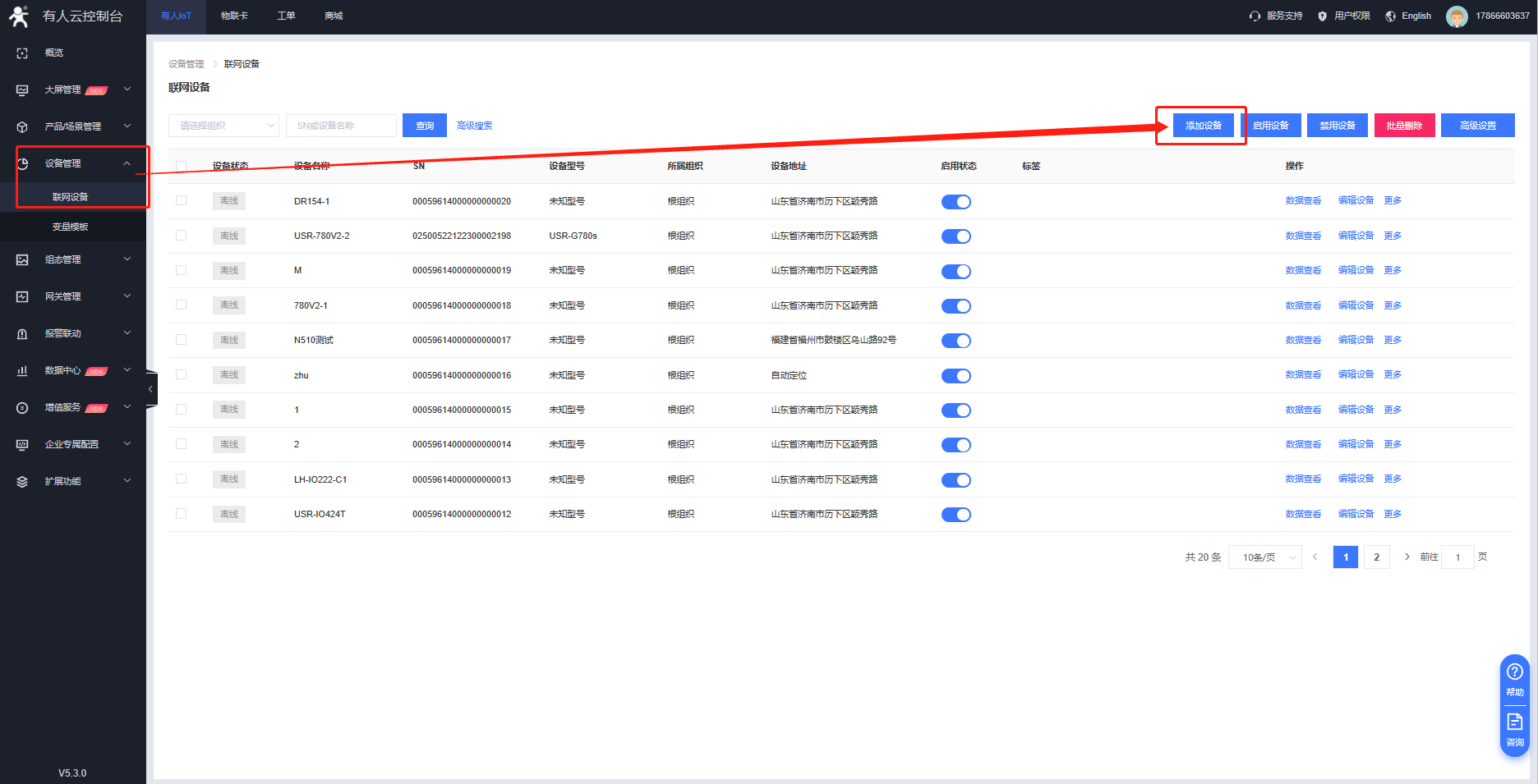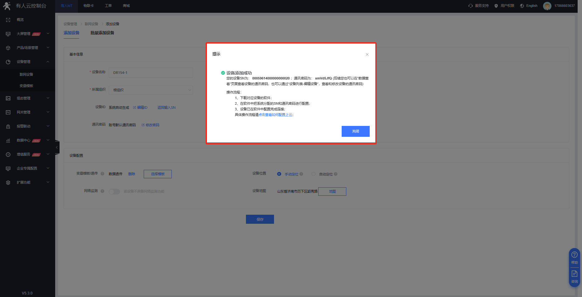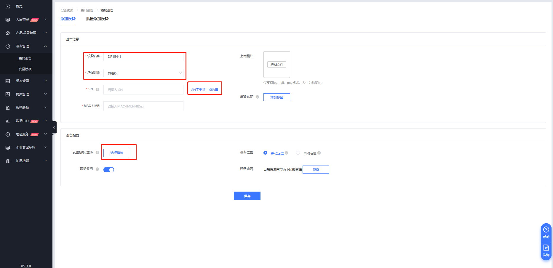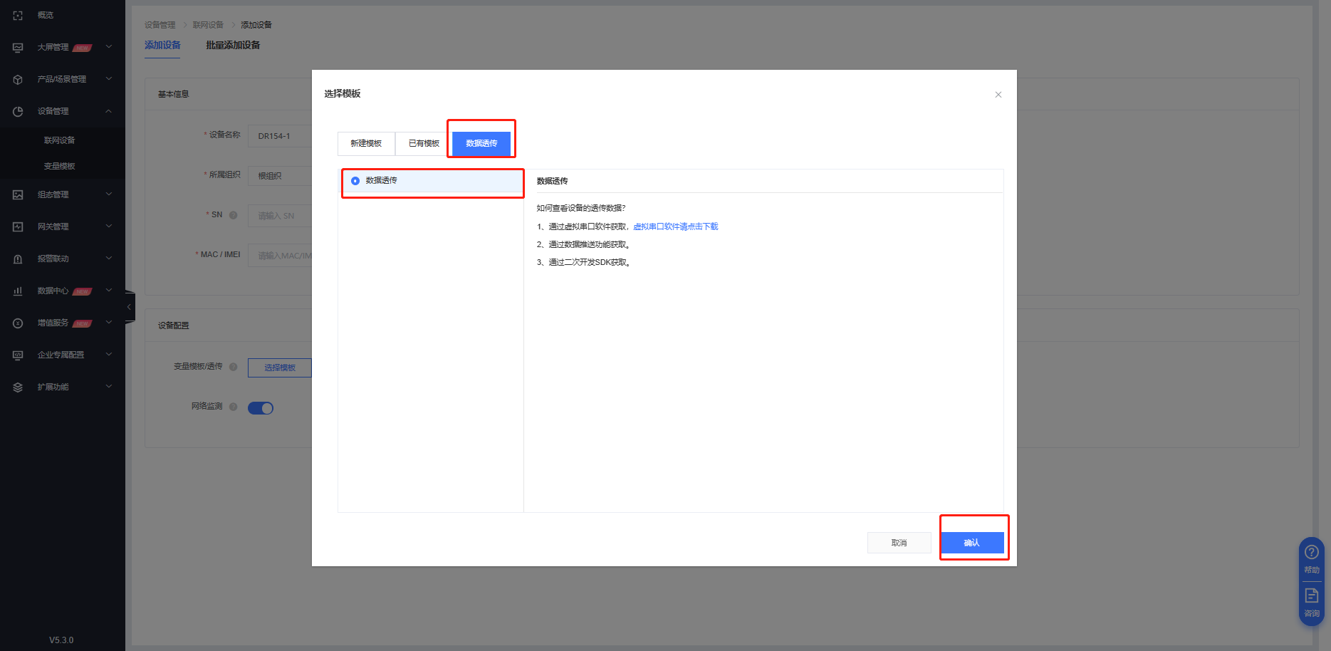 1. 登錄有人云-設備管理-聯(lián)網(wǎng)設備-添加設備,填寫設備名稱,選擇設備組織,選擇“SN不支持,點這里”,模板選擇透傳模板。