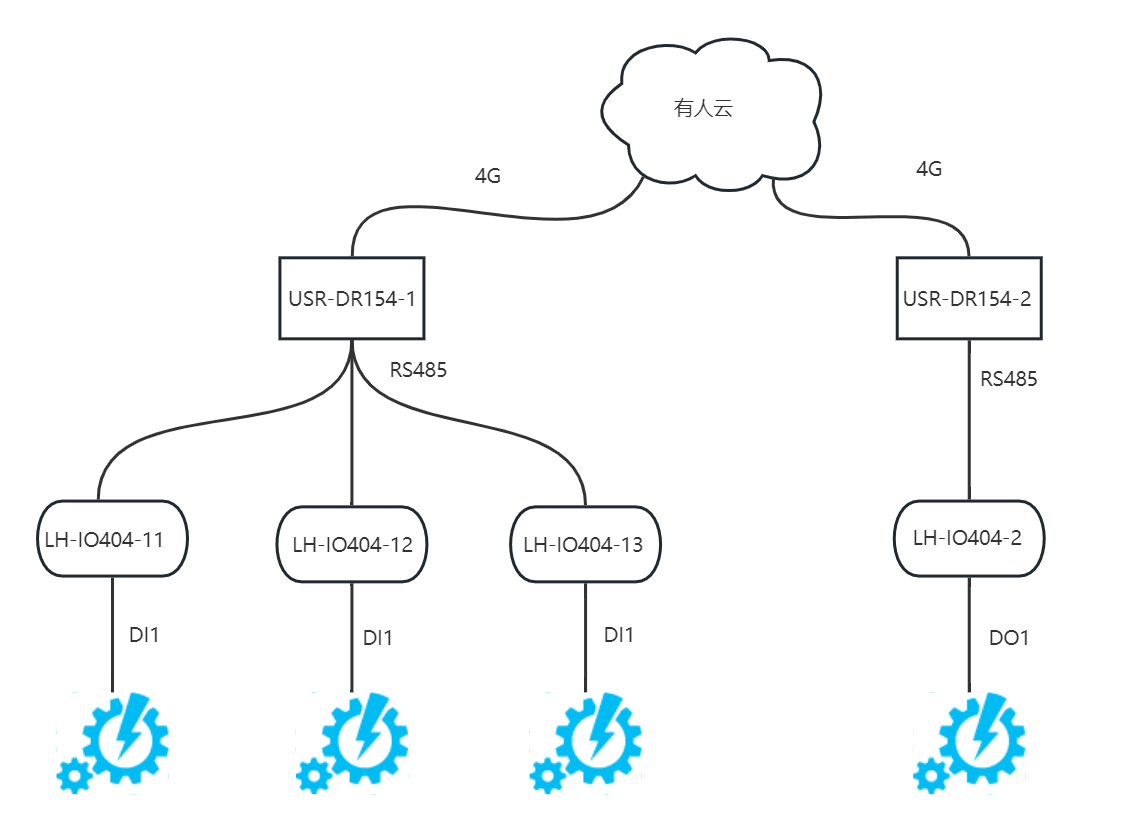 (1) 將標號為LH-IO404-11, LH-IO404-12, LH-IO404-13的三臺串口繼電器和USR-DR154-1通過485接線并接在一起