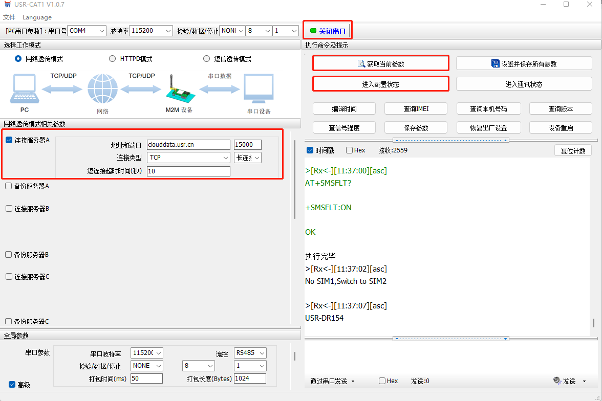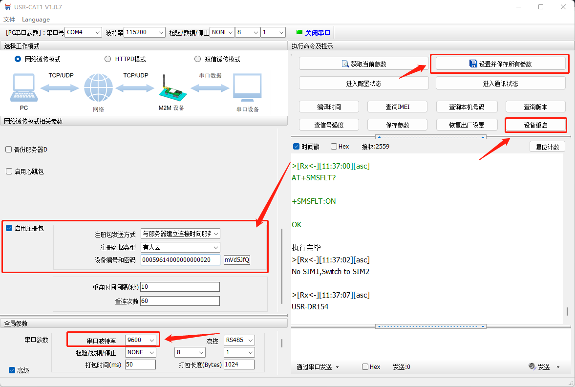 2. USR-DR154通過USB轉485轉化器接到電腦上,使用上位機軟件將波特率修改至9600;服務器IP修改為clouddata.usr.cn和端口號修改為15000;注冊包選擇有人云,填寫云平臺分配的SN和通訊密碼;其他參數(shù)不變。設備重啟后即可在有人云上看到設備上線,兩臺USR-DR154均按照步驟1 2設置.給USR-DR154標號為USR-DR154-1,USR-DR154-2.