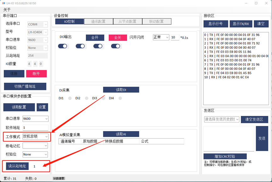 4. LH-IO404通過USB轉485轉換器接到電腦上,打開LH-IO404的上位機,測試繼電器是否能正??刂?,并將繼電器的工作模式設置成雙機非鎖模式,設備地址默認為1 ,4臺LH-IO404均為此設置。給LH-IO404標號為LH-IO404-11, LH-IO404-12, LH-IO404-13, LH-IO404-2